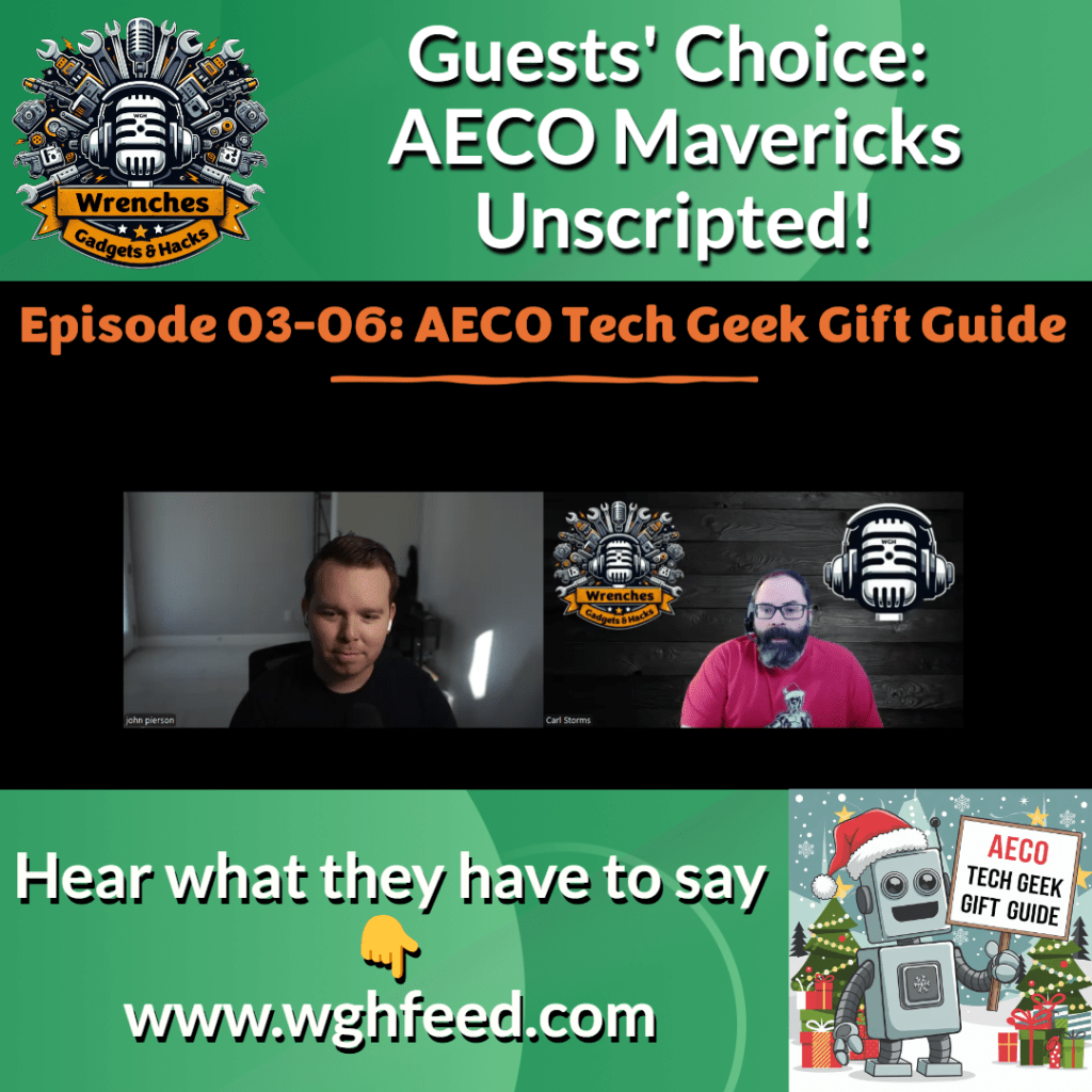 Welcome to the finale of Wrenches, Gadgets & Hacks Series 3, “Guests’ Choice: AECO Mavericks Unscripted.” In this week’s episode, it’s less about the guest, because we don’t have one, and more about the tech! Get out your pens and take notes as John and Carl give their suggestions for our first annual “AECO Tech Geek Gift Guide.”