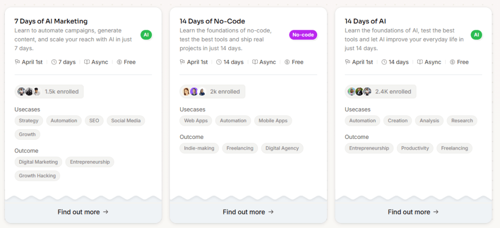 While the 100 Days of AI is no longer a thing, the creators (100 School) are still making microlearning courses for AI and no-code. Now, they’re shorter and more focused—lasting 7 or 14 days – with access opening on the first day of each month. They also offer paid bootcamps if you want to go a little deeper.